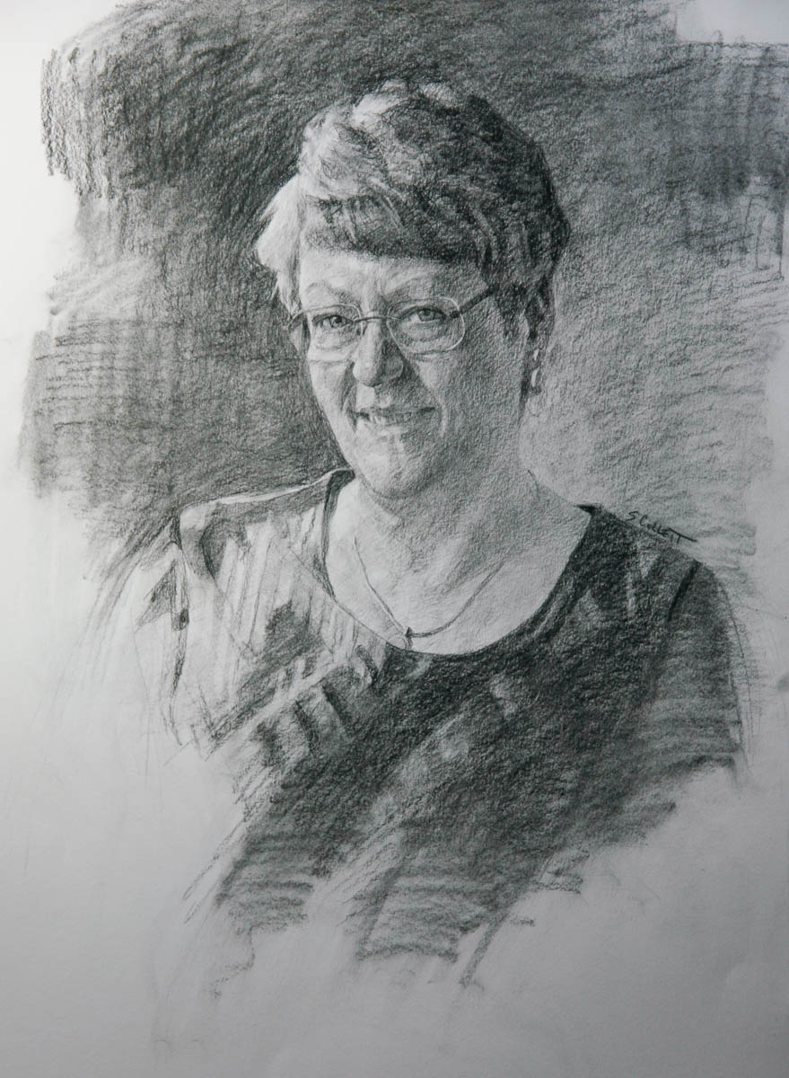 The mediums that I express my portraits in are; in drawing, charcoal and graphite on paper; painting, oil on canvas and pastel applied sanded paper ground. To facilitate the portrait process there is four methods;